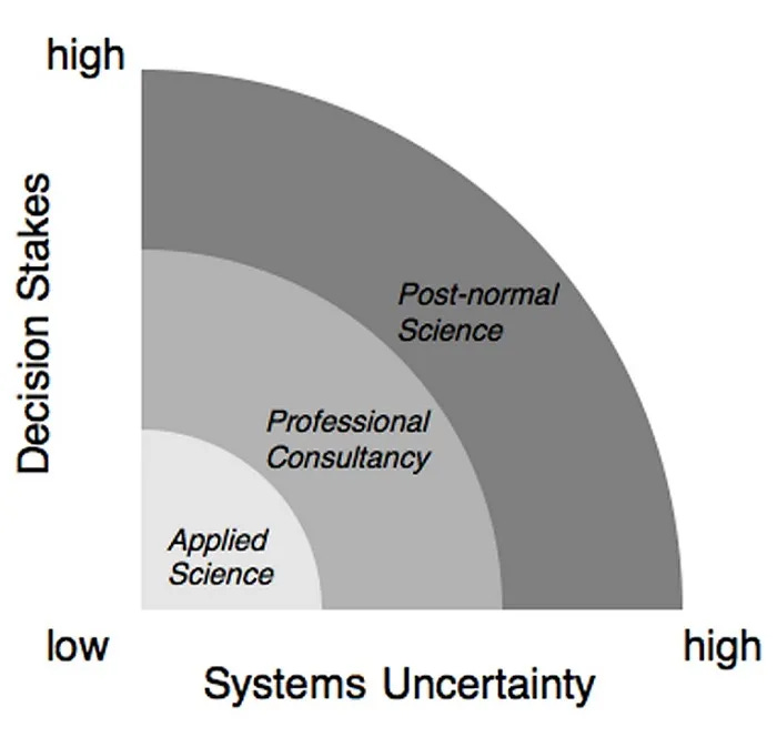 Silvio Funtowicz and Jerome R. Ravetz, architects of what they term ‘Post-Normal Science’, argue that traditional scientific processes are faltering in an age where "facts are uncertain, values in dispute, stakes high and decisions urgent".